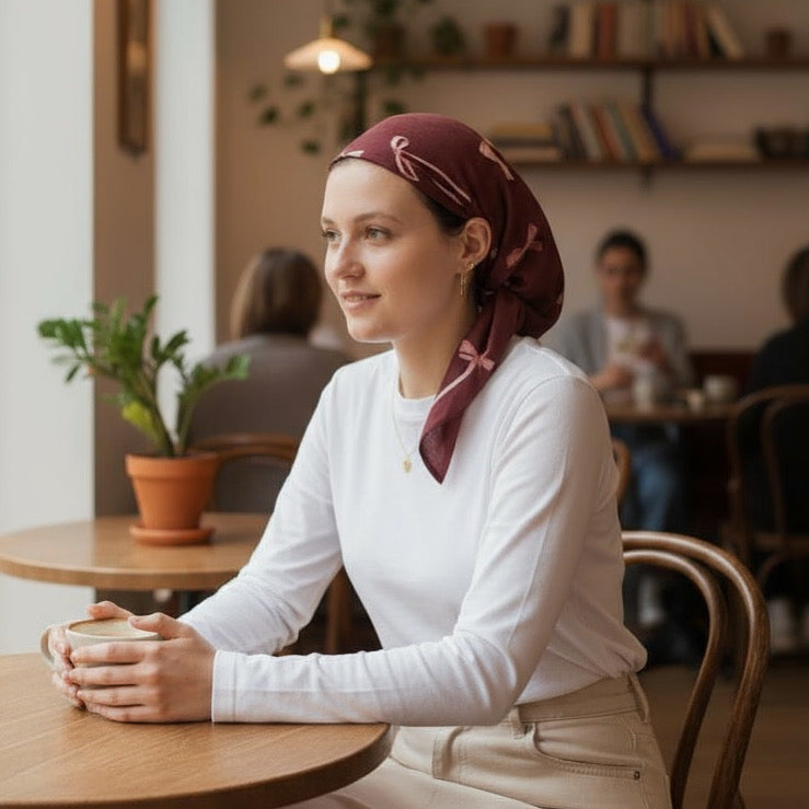 All tichels feature a discreetly sewn-in velvet grip that gently hugs your hair, keeping your tichel secure and comfortable all day — no extra grip needed.