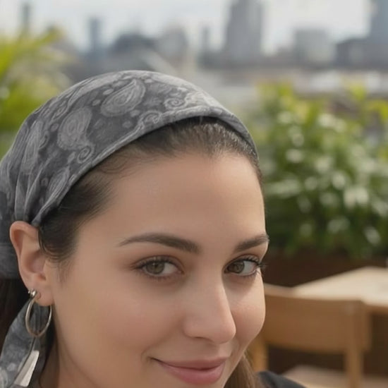 Grey paisley banana. Sewn in velvet grip. Tie closure. 58x58cm