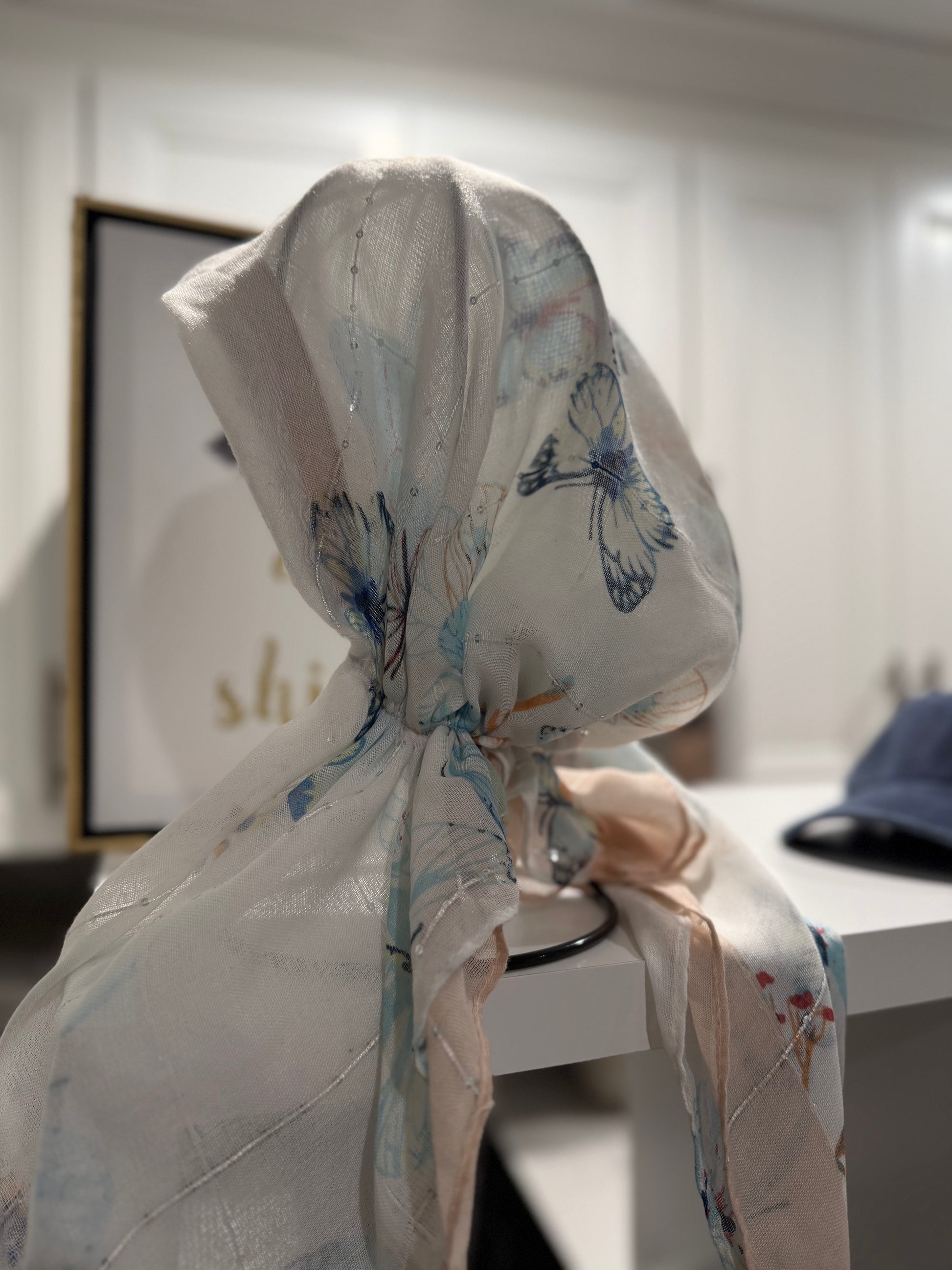 Lightweight, pretied tichel with velvet band and adjustable hidden elastic.